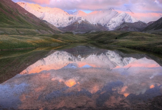 Вид на Пик Ленина с поляны Эдельвейсов, также называемой Ачик-таш (открытый камень). Множество озёр и холмистость создаёт интересный ландшафт. Выдался один день увидеть смену красок в течении 20 минут на закате, в остальные дни, то затянуто облаками, то мы были уже выше, где погода была по схеме: утром холодно всё в снегу, днём жара всё течёт, вечером дубак и снег с 5 часов и до раннего утра.