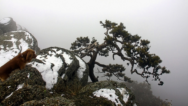 Южный Демерджи. Сосна Коха пристроившаяся на обрыве и пес