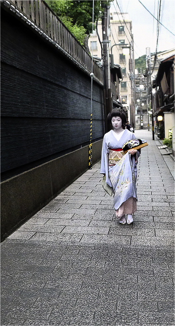 Фотография, конечно, простая и этнографическая... Со слов моих японских знакомых, которым я показал кадр, он достаточно редкий для современной Японии. Профессиональных гейш осталось немного. Пешком они почти не ходят. Только если идти недалеко. Редкость и отсутствие прохожих, зевак и туристов. Автор не в счет. )) Кадр спонтанный.