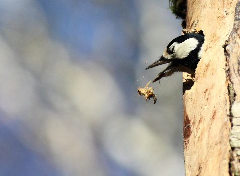 Большой пестрый дятел обустраивает гнездо поздней осенью.
