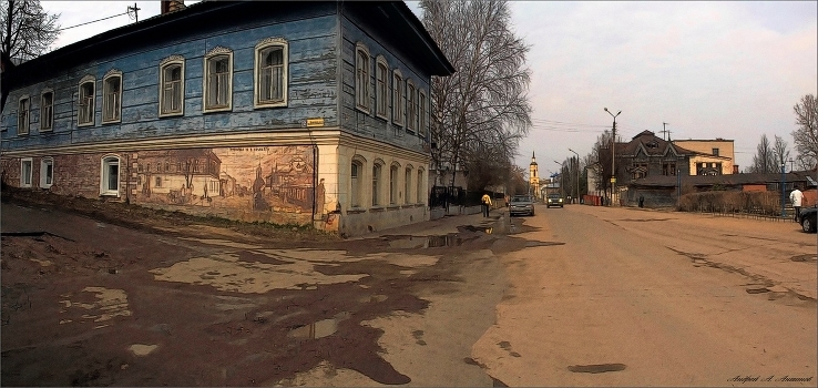 Улица города с росписью художника (Вл. Овчинников) на стене дома.