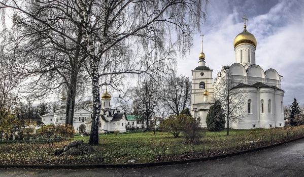 Справа - собор во имя святых благоверных князей – страстотерпцев Бориса и Глеба, построенный в 1537 г. в Борисоглебском Дмитровском монастыре.