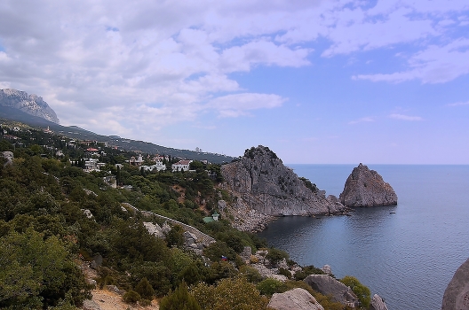 В Крыму много причудливых скал и гор, затейливые формы которых напоминают сказочных персонажей. Одной из таких скал является скала Дива, что в поселке Симеиз на Южном берегу, сам поселок расположен у подножья горы Кошка, вдалеке виднеется гора Ай-Петри.