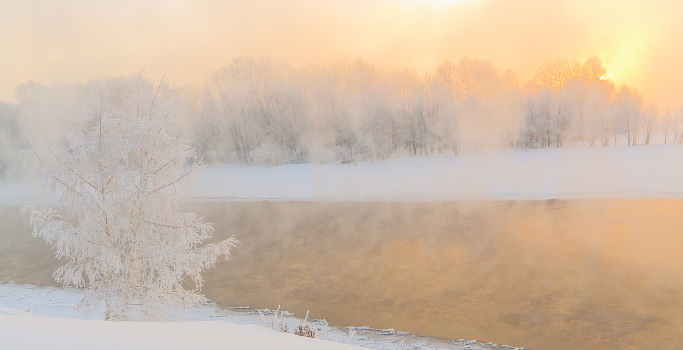 Мороз -30, раннее утро, на реке густой туман