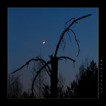 Начало мая, далеко за городом, тишина. Ландыши еще не проклюнулись. Сон-трава только-только появилась. Штатив. Ствол сосны, развалившийся от старости, образовал вот такую картинку. "Павучка" не шопил. Все так, как было на самом деле.
