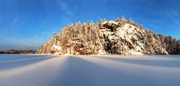 Озеро Ястребиное, январь 2016. Лучи восходящего солнца пробиваются между деревьев, оставляя длинные мягкие тени на снежной глади застывшего озера.