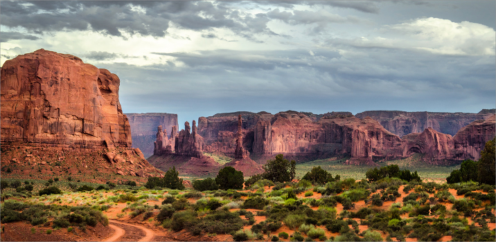 Долина монументов знакома многим туристам по голливудским вестернам и рекламным роликам ковбойской тематики. Когда подъезжаешь к этому памятнику природы, кажется, что находишься не на Земле, а на другой планете — до самого горизонта простирается коричнево-красная пустыня, посреди которой возвышаются одиночные скалы с плоскими вершинами, окутанные сиреневатыми оттенками неба.