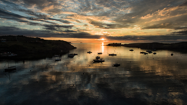 Те, кто бывал в доме-музее Сальвадора Дали в Кадакесе знают, что в его спальне высоко под потолком сделано окно, так чтобы он наблюдал восход еще только пробудившись. Примерно так он мог бы видеть солнце, поднимающееся водой, над бухтой Портлигат, над лодками, ожидающими новый день. Этот снимок сделан дроном с небольшой высоты, но точно по направлению от дома Дали к выходу в море и к скалам, которые он так любил.