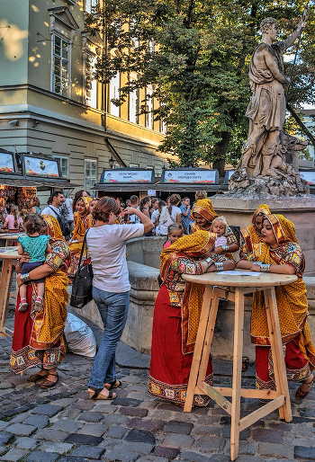 Зрители фотографируют своих детишек на руках у девушек артисток из Индии