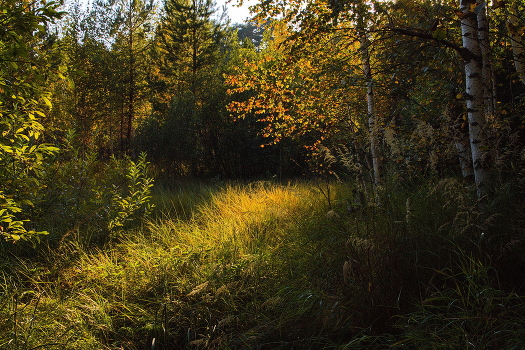СОЛНЕЧНАЯ ДОРОЖКА В СУМЕРКАХ ЛЕСА.