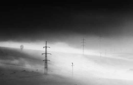 ЛЭП и коровы в утреннем тумане