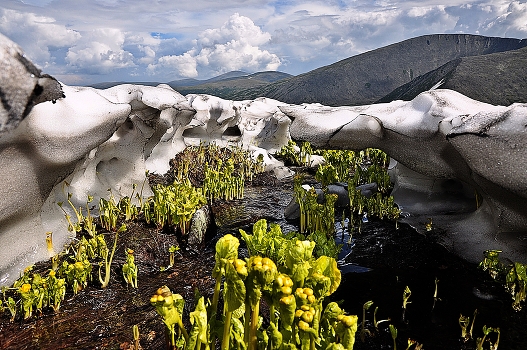 У нас калужница цветёт в начале мая. А тут в горах Алатау весна приходит в августе. Остатки снега,льда,а из трещин льда-поле вытянутых к солнцу цветов. Расцвели подо-льдом!