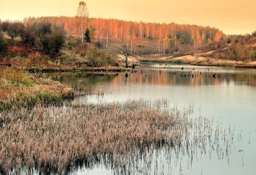 Утро осеннее, солнце осветило край леса.