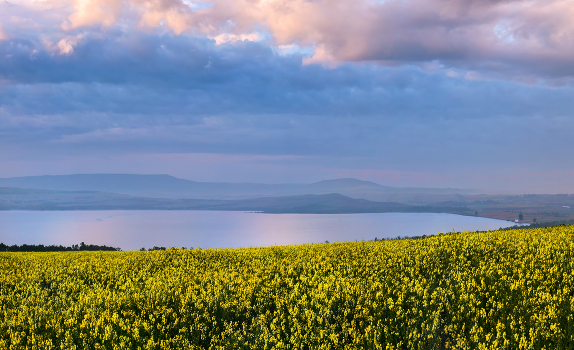 Цветущий рапс на фоне озера