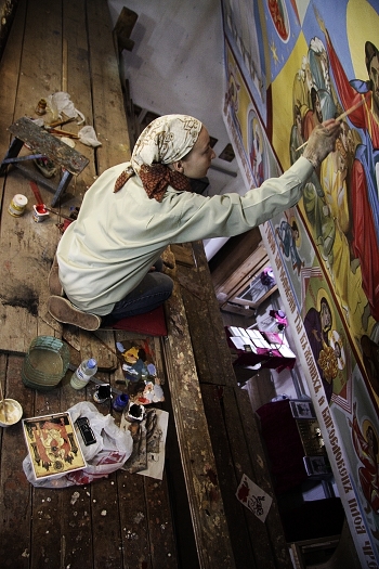 Катя (с компанией слудентов худграфа ЮФУ) расписывает храм в селе Советка