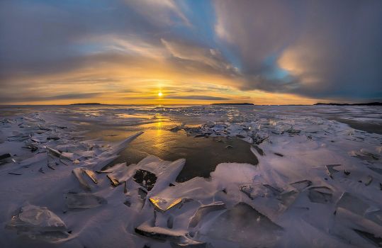 Вернулся из 3-дневного фототура, который я проводил на Ладожском озере. Фото со второго дня фототура. Повезло с красочным закатом. Выезжали в открытую Ладогу на аэроботе (это судно на воздушной подушке) в поисках интересных торосов, льдин и чистого от снега льда. Было интересно с комфортом и в полной безопасности ехать, будто летишь по замёрзшему Ладожскому озеру навстречу закатному солнцу, высматривая пейзажи.