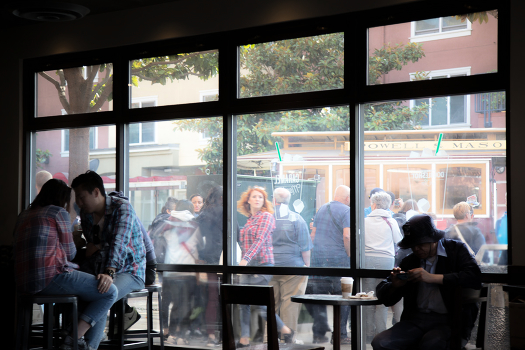 Скромная кофейня в Сан Франциско. За стеклом видна остановка уникального трамвая на канатной тяге, который бегает с 19го века.