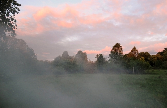 От речки на возвышенность ползёт туман