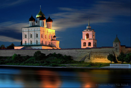 Легенды средневековья России. Вид на Псковский кремль из-за реки Великой