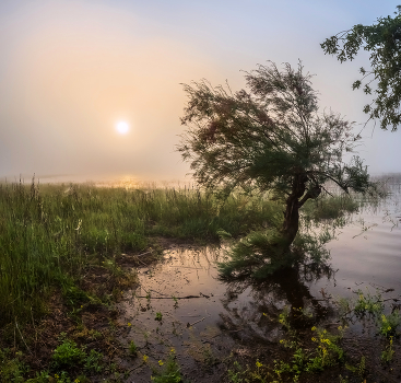 Туманный рассвет во время половодья.