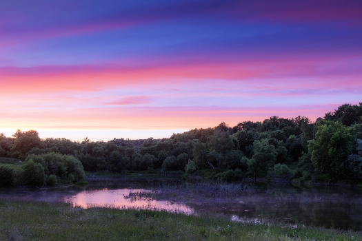 Разноцветный закат на деревенском пруду.