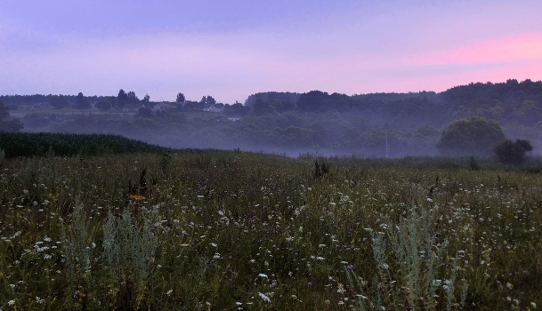 Спящая деревня на косогоре в утреннем тумане