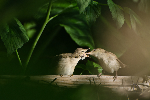 Садовая камышовка кормит птенца слётка. Россия. Тульская область. Ленинский район. Архангельское.