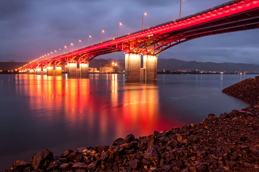 Красноярск. Новый, четвёртый мост через реку Енисей. Лил сильный осенний дождь и только включили подсветку моста.