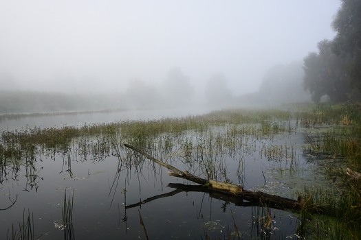 Туман на лесном озере скрывал очертания леса.