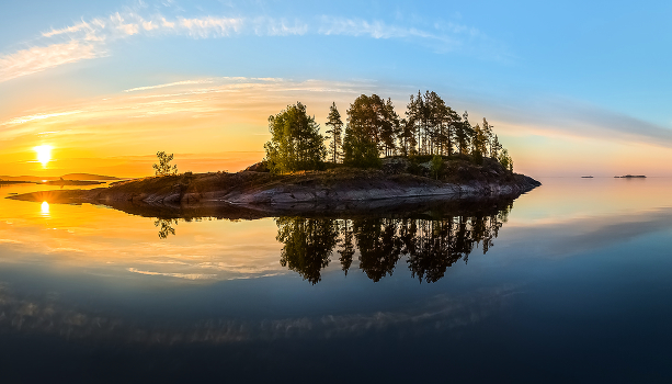 Такие рассветы нужно ловить! Как комета, остров пролетит, ярко вспыхнув интересной композицией. Когда всё складывается, и рассветные облака, и цвет, и отражение, и редкий полный штиль на Ладоге, тогда нужно быть тренированным видеть такие моменты. Всё это длится секунды, особенно учитывая, что эти панорамы я снимал с движущейся моторной лодки, так что, это и было буквально – кометы-острова с ярким хвостом облаков. Только опыт, постоянные тренировки, уверенность в фототехнике, понимание всех технических сложностей съёмки, позволяет отключиться от технических условий, контроля над съёмкой и отдаться чистому творчеству, т.е. видеть миг и быть готовым сохранить его!