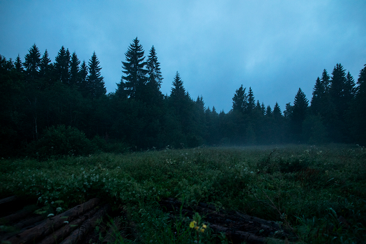 После урагана природа затихла, над болотом поднимается легкий туман.