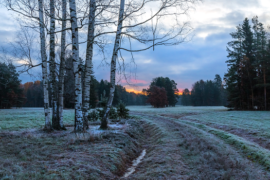 Осенний рассвет с инеем. Рассвет был ярко-красочный, картинный. Чистым воздухом и штилем, только листья опадали после ночного заморозка. Санкт-Петербург. Парк Павловск. 23 октября, 2017.