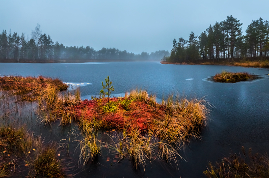 Был пасмурно-туманный рассвет. Морозно, первым ледком схватилась вода. Воздух и небо в стальной синеве. Зато болотный мох и трава, горели островками осенних красок. Это разноцветий вдохновляло на съёмку, несмотря на пасмурную погоду и пустое небо.