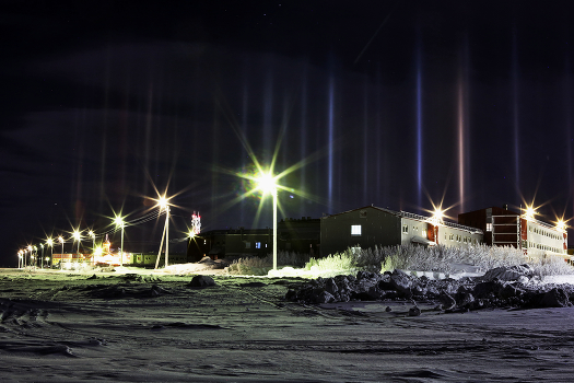 ЯНАО. Заполярный город спит, объятый зимней стужей. Это реальное явление -"морозные столбы" наблюдается в сильные холода при лёгком падающем снеге.