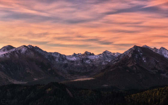 Карачаево-Черкессия, окрестности Архыза, пер. Пхия, начало октября. Накануне вечером я уже в густых сумерках поднялся на этот несложный перевал. Торопился преодолеть затяжной подъем, взмок до нитки, а перевал встретил очень сильным ветром и холодом. После ускоренной установки палатки и ужина впопыхах долго согревался в теплом спальнике. Думалось - все, заболел. Обошлось. Но наградой за вечерние мытарства был этот красивейший морозный рассвет.
