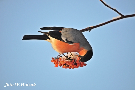 Снегирь на рябине зимой.