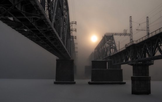Железнодорожный мост через Енисей в Красноярске, снято в мороз -35. Из за парящей воды и тумана мост словно отрезан от мира и живет сам по себе..