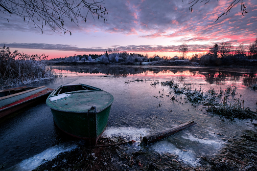 Лодки подернутые льдом на Дубне.