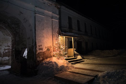 Александро-Ошевенский монастырь находится в 50 км от Каргополя. Преподобный Александр Ошевенский - самый почитаемый святой Каргопольского края. Сейчас монастырь восстанавливается. Фото сделано Рождественской ночью. На снимке надвратный храм Свт. Николая.