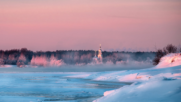 Дубна, раннее морозное утро. Вид на церковь в Ратмино из-за Волги.