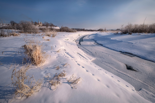 Пермский край. Морозное утро на Усолке. На заднем плане Верхнечусовская Богородице-Казанская Трифонова женская пустынь.