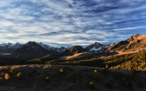 Карачаево-Черкессия, окрестности Архыза, перевал Пхия, начало октября. На перевале обелиск, посвященный защитникам этих мест (бои 1942 г). Солнце только-только вышло из-за гор...