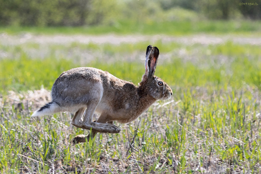 Стремительный полет зайца над апрельской степью в окрестностях хутора Демишева ярким солнечным днем