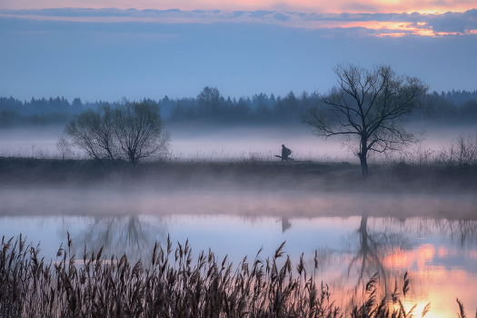 Майское туманное утро, рыбаки занимают места.