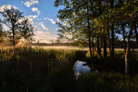 на рассвете в лесу