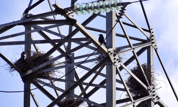 Гнездовья грачей на высоковольтном столбе