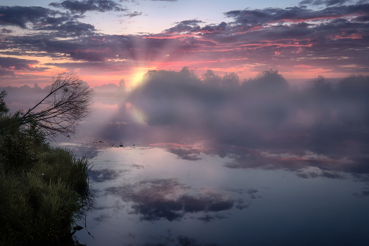 Первые солнечные лучи из-за туманной реки