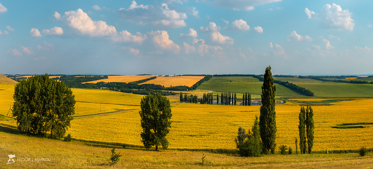 Это и есть наше Ставрополье. В разноцветных полях на пологих склонах холмов. Снежные облака подчёркивают своей вертикальной ярусной воздушностью гармонию и порядок ровных квадратов полей. С жёлтыми подсолнухами, с чистым золотом пшеницы, с тёмной зеленью кукурузы. И стройные тополя на фоне летней синевы – прям мечта художника.
