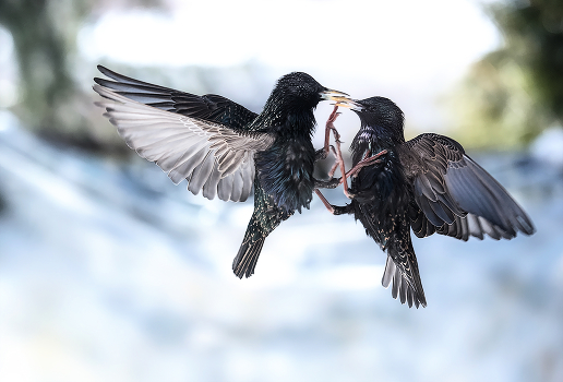 Нередко дерется со своими соотечественниками, да и другим птицам достается, если скворец считает , что "красная черта" пересечена