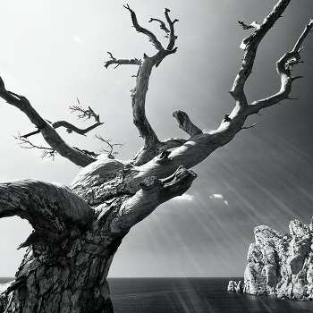 В Крыму, в окрестностях Нового Света, есть сосна, которую я просто не могу не сфотографировать каждый раз, когда бываю там. Никогда "не ловил" таких "зайцев-лучей", однако на этой фотографии мне они показались очень кстати.